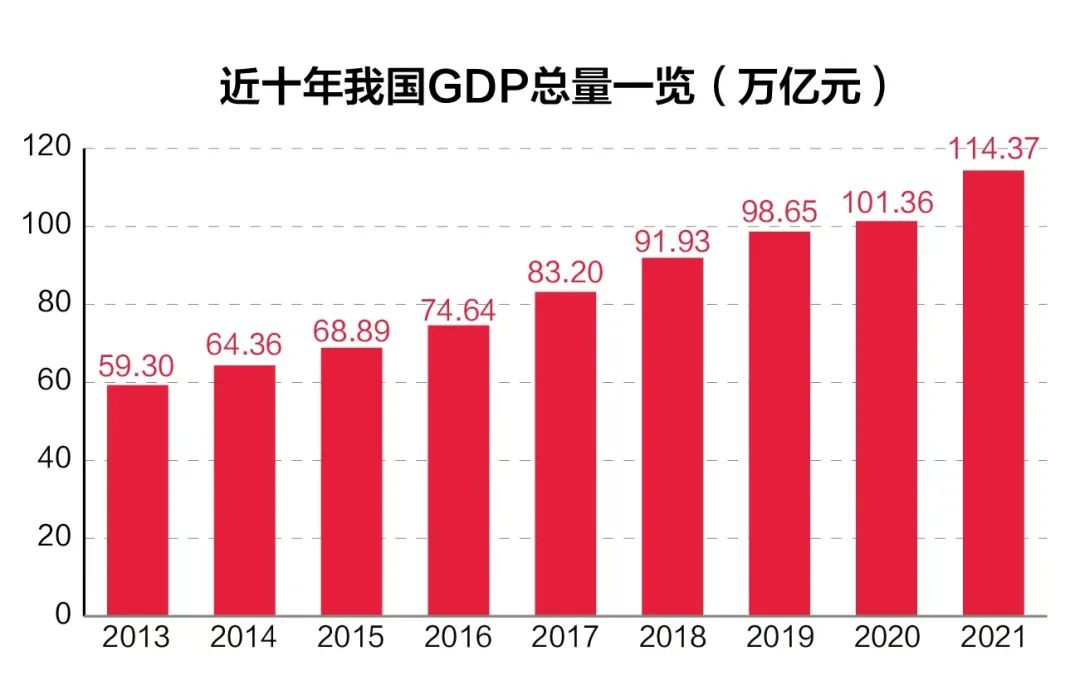 國家統計局數據顯示,2013年至2021年,我國國內生產總值(GDP)年均增長6.6%,高於同期世界2.6%和發展中經濟體3.7%的平均增長水平。其中,2014年、2016年、2017年、2018年、2020年,國內生產總值相繼跨越60、70、80、90、100萬億元大關,2021年更是突破110萬億元,達到114.4萬億元,按不變價計算為2012年的1.8倍。