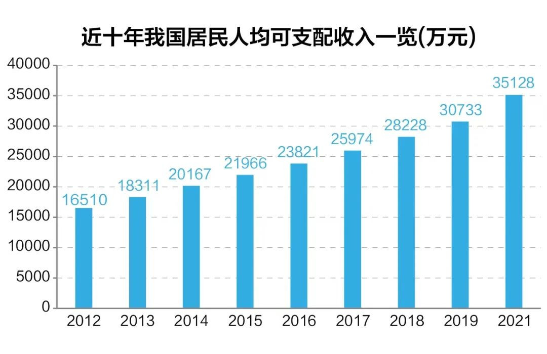 一是居民收入與經濟同步增長。2021年,全國居民人均可支配收入35128元,比2012年增加18618元,年均實際增長6.6%,快於同期人均國內生產總值年均增速0.5個百分點。