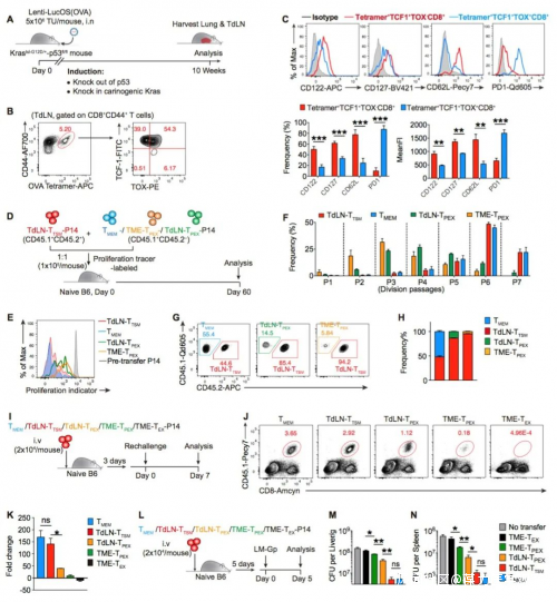利用多種移植瘤及原位腫瘤誘導模型,研究團隊首先檢測了引流淋巴結內的腫瘤特異性CD8+ T細胞,發現其中一類高表達TCF-1、低表達PD-1、不表達耗竭特異性轉錄因子TOX的細胞羣嚴格符合經典免疫記憶特徵:不依賴於抗原長期存活;再次遇到抗原,迅速大幅擴增,並分化為功能性的效應細胞;提供長期的免疫保護。