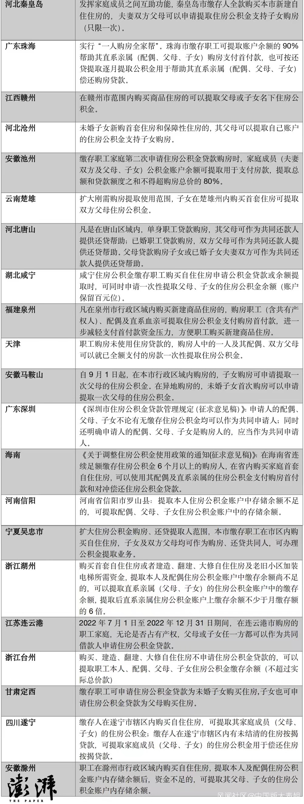 據澎湃新聞不完全統計,今年以來,至少包括湖南邵陽、廣東潮州、河北秦皇島、廣東珠海、江西贛州、河北滄州、安徽池州、雲南楚雄、河北唐山、湖北咸寧、福建泉州、天津、安徽馬鞍山、廣東深圳、海南、河南信陽、寧夏吳忠市、浙江湖州、江蘇連雲港、浙江台州、甘肅定西、四川遂寧、安徽滁州、廣東汕尾、寧夏銀川、四川資陽、四川綿陽、遼寧瀋陽、浙江紹興、山東聊城等超30個城市發佈公積金貸款新政,多地在政策中提到,子女購房可提取父母公積金,實行“一人購房全家幫”。