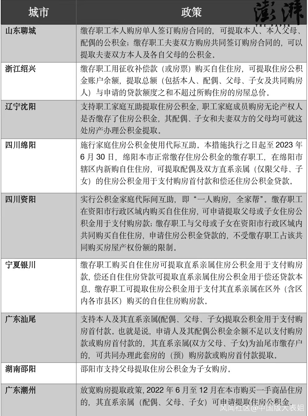 以四川綿陽為例,9月28日,四川綿陽市發佈《綿陽市人民政府辦公室關於印發進一步促進綿陽市房地產市場平穩健康發展若干措施的通知》,《通知》提出,施行家庭住房公積金使用代際互助,即“一人購房全家幫”。本措施執行之日起至2023年6月30日,綿陽市正常繳存住房公積金的繳存職工,在綿陽市轄區內新購自住住房,可提取配偶及雙方直系親屬(僅限父母、子女)的住房公積金用於支付購房首付款和償還住房公積金貸款。