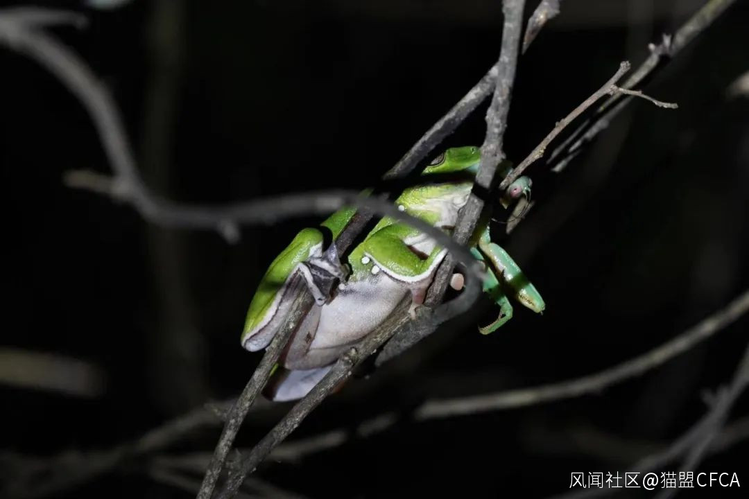第三隻螳螂在一隻大樹蛙的嘴裏。