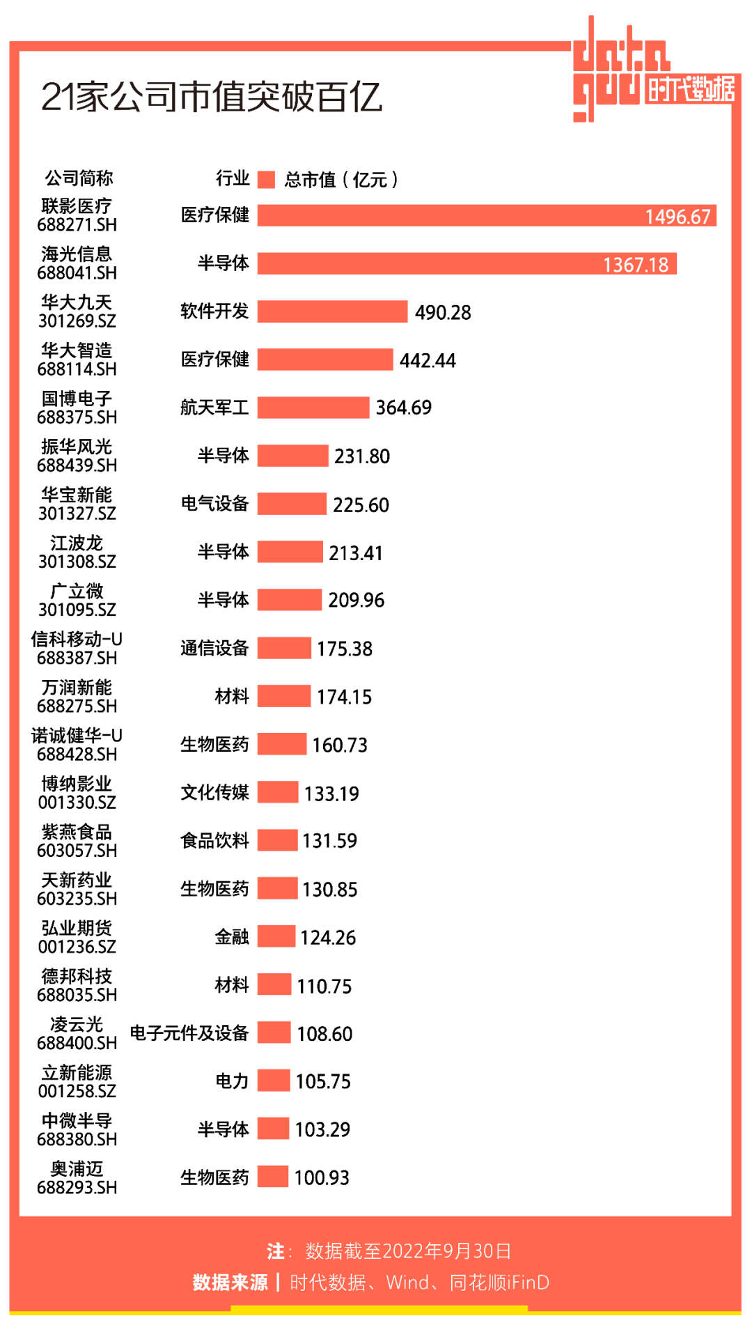 從上市後公司市值來看,第三季度一共有21家公司上市後市值突破100億元,佔新增上市公司總數的15.79%。