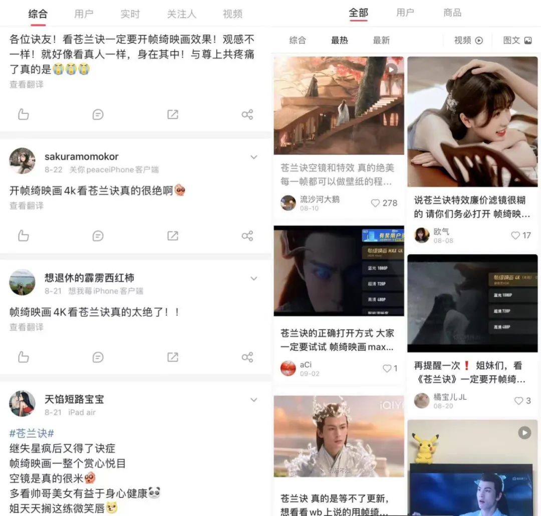 “幀綺映畫”的吸粉程度,從微博、小紅書上滿屏“看《蒼蘭訣》,不允許還沒開幀綺映畫”的討論可見一斑。“每一幀都可以做屏保”的絕美效果,“好像看真人一樣身在其中”的沉浸氛圍感讓觀眾直呼“視覺盛宴”。不僅如此,不少二刷《蒼蘭訣》的用户也感受到了升級後視聽體驗的“飛昇”,紛紛化身成為“自來水”開啓瘋狂安利模式。