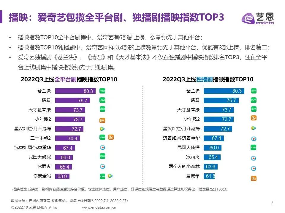 藝恩數據新鮮出爐的《Q3國產劇集市場研究報告》也再次佐證了愛奇藝在劇集市場的地位。報告顯示,Q3愛奇藝劇集上線數量和平均播映指數均排名第一;全平台劇播映指數TOP10、獨播劇播映指數TOP10、播放量指數TOP10和用户熱度TOP10這四大榜單中,愛奇藝上榜數量均領先於其他平台;愛奇藝獨播劇《蒼蘭訣》《請君》和《天才基本法》不僅在獨播劇中播映指數排名TOP3,還在全平台上線劇集中播映指數領先於其他劇集。