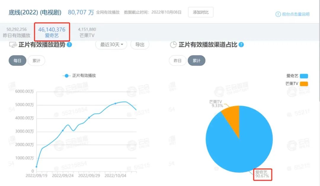 以目前正在多平台熱播的《底線》為例,雖然對於愛奇藝來説是一部聯播劇,但播出效果卻完全不亞於獨播劇。雲合數據顯示,愛奇藝在《底線》正片有效播放渠道佔比中高達90.67%,遠遠高於其他平台,可以説是以單一平台之力撐起了這部爆款。