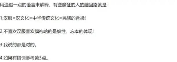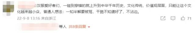 最後,還出現了“漢服警察的警察的警察”,直接説雖然我不懂漢服,但我覺得你們“漢服警察的警察”就是不把文化傳承當回事,簡直就是漢奸。