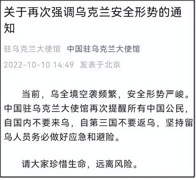 其中提到, “當前,烏全境空襲頻繁,安全形勢嚴峻。”