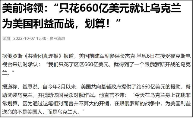 也難怪美國前陸軍副參謀長在10月6日接受採訪時説:“只花了區區660億美元,就讓烏克蘭為美國利益而戰。”