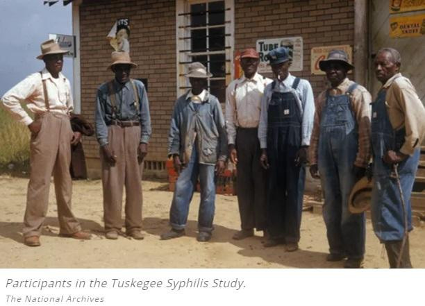 參與美國塔斯基吉梅毒實驗的非洲裔人員。圖片來源:美國國家檔案館 實驗對象想象不到的是,在1947年青黴素已成為梅毒的標準治療方法後,塔斯基吉實驗仍在進行,而自己未得到青黴素治療。相反,有些人被注射了有毒的砷和汞作為“治療”。