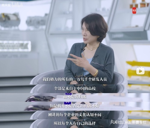 董明珠提及格力的研發團隊,説格力是一家非常特殊的企業,沒有外資,也沒有所謂的國際人才。董明珠表示:“格力一萬幾千個研發人員,全部來自中國的高校,而不是海歸派。不是否定海歸派,是一種企業的文化認知,每個人有自己的選擇。”