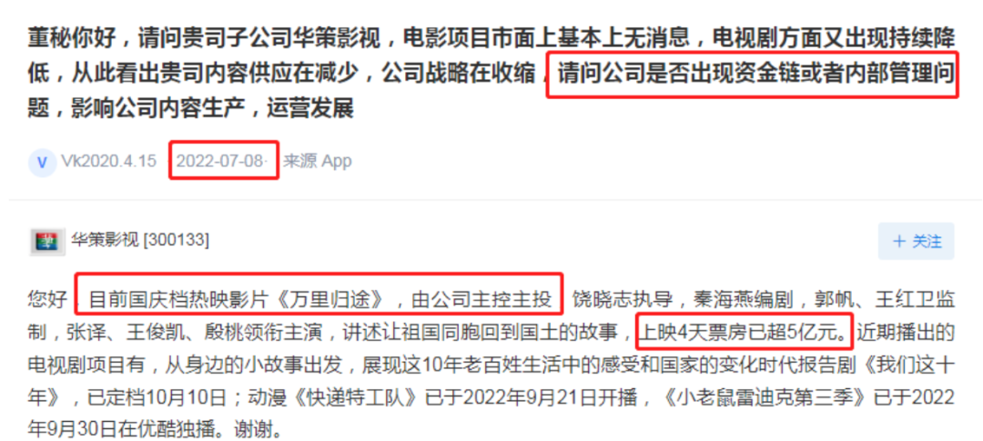 為了給《萬里歸途》帶人氣,國慶股市休市時,華策影視卻在互動易平台異常活躍。