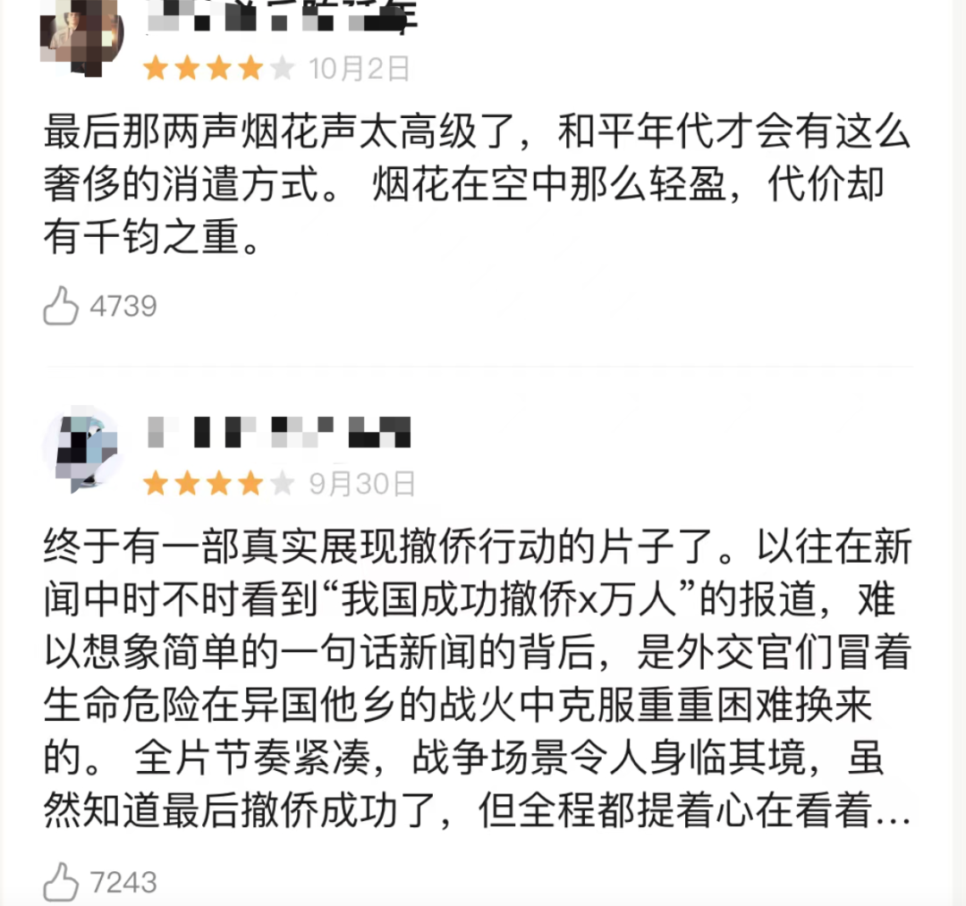 不得不承認,《萬里歸途》受追捧,少不了同行的襯托之功。正是這股力量,幫助《萬里歸途》打破原本“主旋律”標籤的禁錮,逆襲成為國慶檔最大贏家。