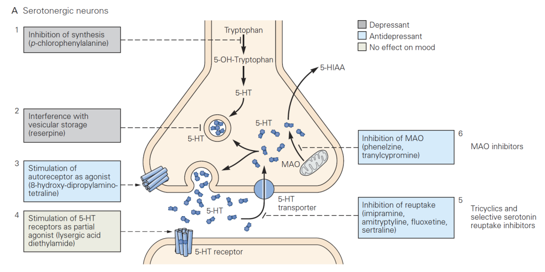 圖7. 5-羥色胺回收抑制劑的抗抑鬱作用機理。來源:Kandel, E.R. et al (2021) Principles of Neural Science, 6th Edition。