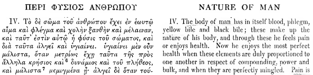 圖1. 希波克拉底《人的本質》一書中關於四體液學説的段落。丨來源:Jones, W.H.S.(1931) Hippocrates, Volume IV: Nature of Man。