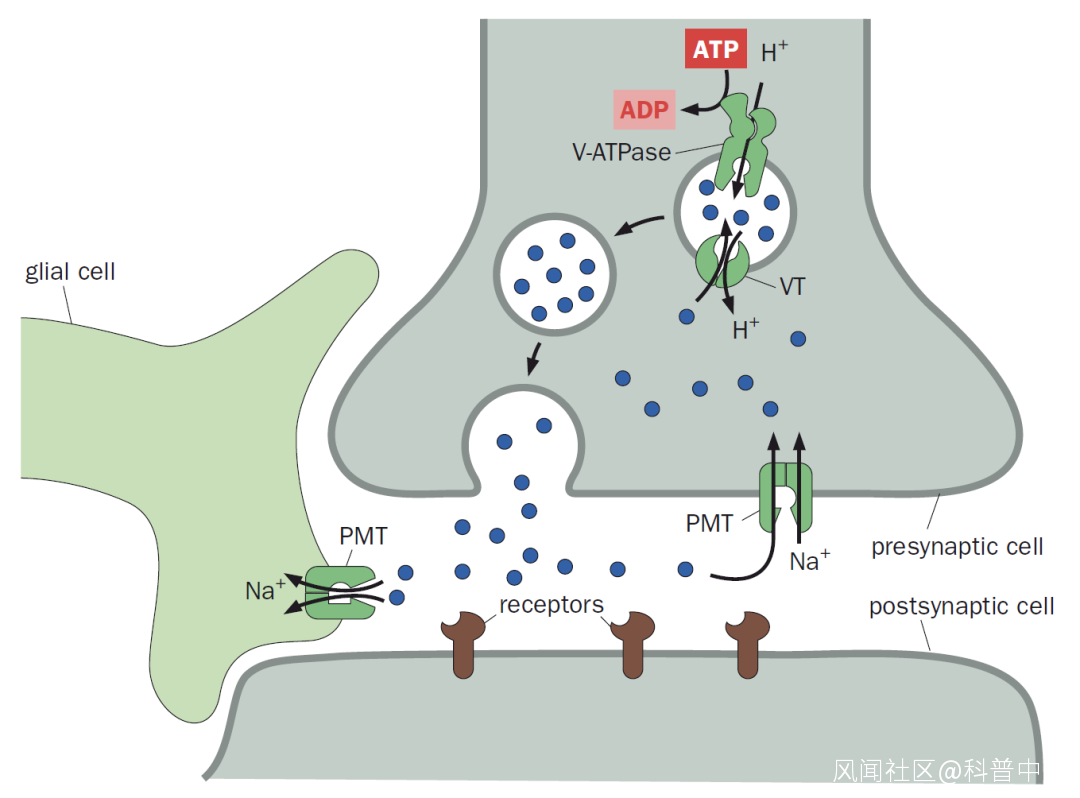 正常生理情況下,為了使突觸後神經元能夠連續不斷地感應來自突觸前神經元的動作電位,已從突觸前神經元釋放的神經遞質在完成信號傳導後,必須及時高效地從突觸間隙被清除。由於神經遞質通過擴散離開突觸間隙的速度較慢,神經系統還有兩種快速清除神經遞質的機制,要麼動用突觸間隙中的特異性代謝酶來原位降解 (例如MAO就是負責降解單胺類神經遞質的氧化酶),要麼通過突觸前神經元或者神經膠質細胞質膜上的特異轉運蛋白來回收 (圖6)。