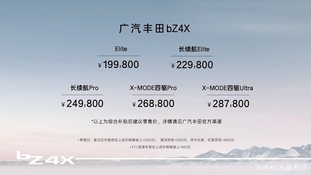 10月10日,從官方公佈的售價信息來看,**這次廣汽豐田 bZ4X 共提供了五個版本給大家選擇,**大夥可以根據自己用車場景和使用需求選擇最適合自己的版本。