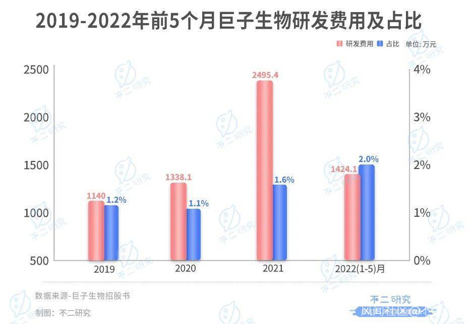 招股書顯示,截至2022年5月31日,鉅子生物研發團隊為124人,佔總人數的14.8%。2019-2021年及2022年前5個月,鉅子生物研發費用分別為1140萬、1338.1萬、2495.4萬及1424.1萬,在總收入中佔比分別為1.2%、1.1%、1.6%和2.0%。