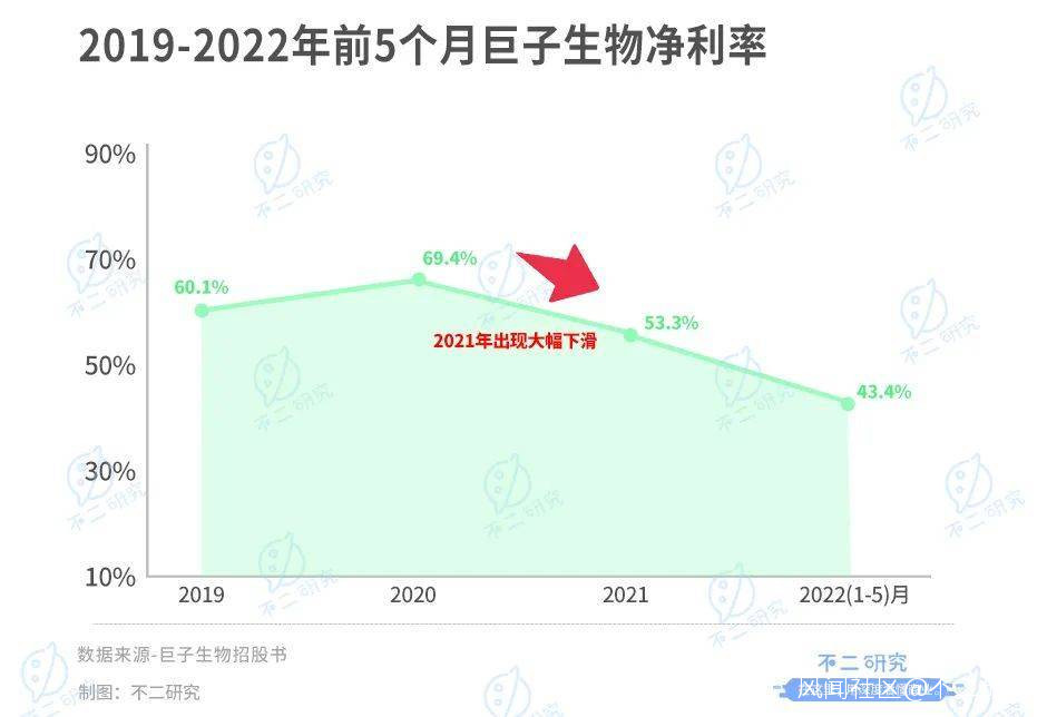 經營數據看似亮眼,但「不二研究」發現,鉅子生物的業績中仍存在不穩定因素——淨利率回落。招股書顯示,2019-2021年及2022年前5個月鉅子生物淨利率分別為60.1%、69.4%和53.3%和43.4%,2021年出現大幅下滑。