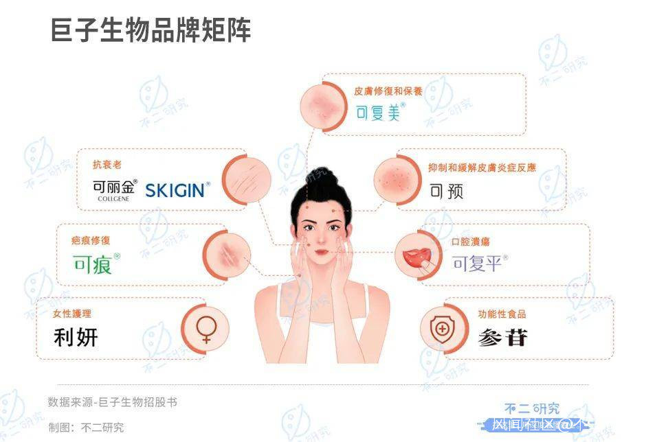 截至2022年4月,鉅子生物產品組合中共有105項SKU,涵蓋功效性護膚品、醫用敷料和功能性食品等領域,共有可復美、可麗金、可預、可痕等8個品牌。