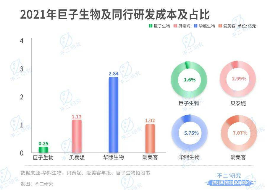 雖然“重營銷輕研發”已成行業通病,但鉅子生物的研發投入在同行中也略顯遜色。年報數據顯示,2021年華熙生物研發投入2.84億元,佔營收的比例為5.75%;愛美客(300896.SZ)研發費用支出1.02億元,佔營收7.07%;貝泰妮的研發費用為1.13億元,佔營收2.99%。