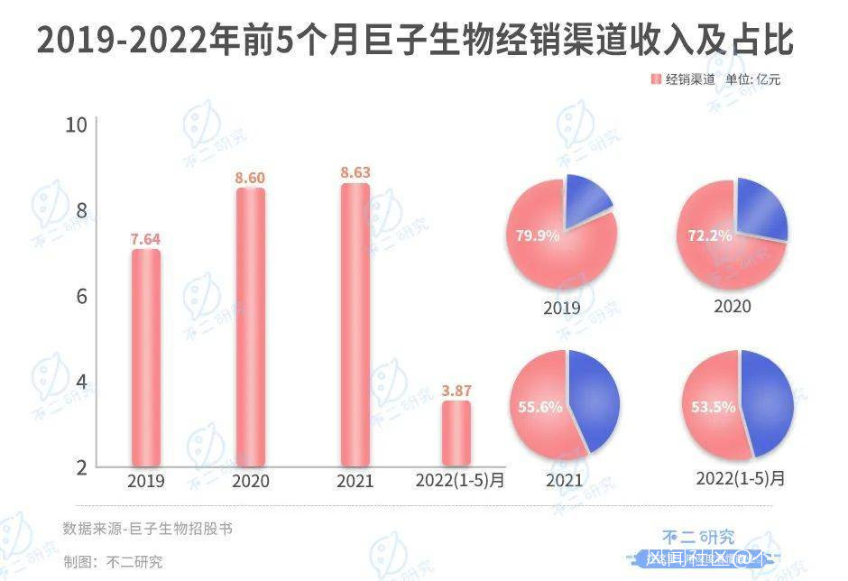 「不二研究」發現,鉅子生物對經銷商的依賴程度較高。招股書顯示,2019-2021年及2022年前5個月,經銷渠道的收入分別為7.64億、8.60億、8.63億和3.87億,佔總收入比重分別為79.9%、72.2%、 55.6%和53.5%。儘管2021年佔比有所下降,但仍是鉅子生物收入的第一大來源。