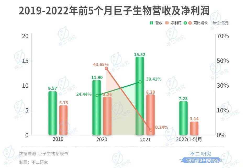 「不二研究」據鉅子生物新版招股書中發現:2022年1-5月,其營收為7.23億元,同比增加38.89%;同期的淨利潤為3.14億元,同比增加8.33%。