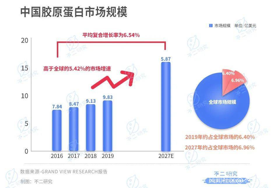 根據Grand View Research報告,中國膠原蛋白市場規模增速顯著高於全球市場增速。2019年中國膠原蛋白的市場規模增長至9.83億美元,約佔全球市場的6.40%;而到2027年,中國膠原蛋白的市場規模預計將達到15.76億美元,約佔全球市場的6.96%,2016-2027年年平均複合增長率為6.54%,高於全球的5.42%的市場增速。未來國內膠原蛋白市場,或許將實現規模和產量的雙向增長。