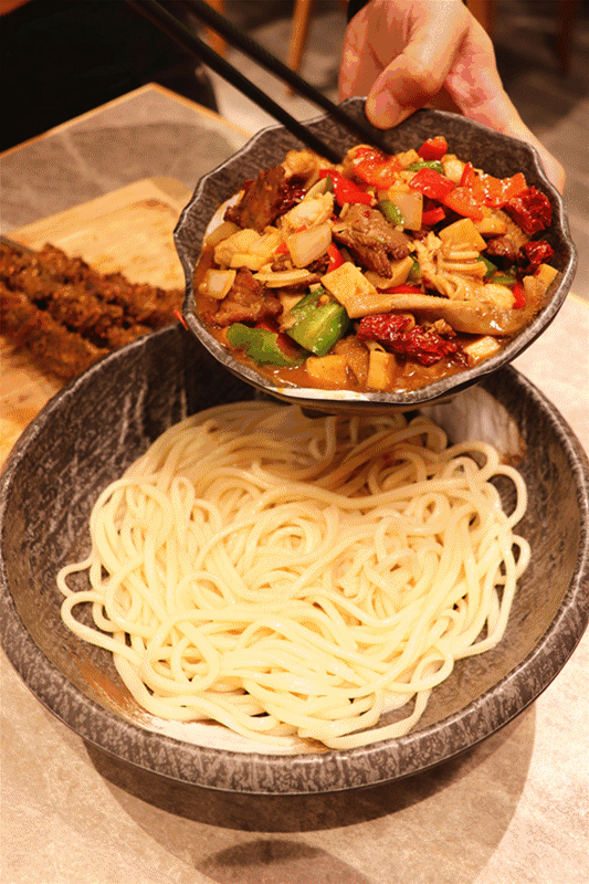 **新疆拌麪也叫拉條子,勁道****有味的手工麪條配上一鍋熱騰騰的菜,奇妙的搭配觸動你的味蕾!**此時的你會配上一句:哦豁,老闆加個面!