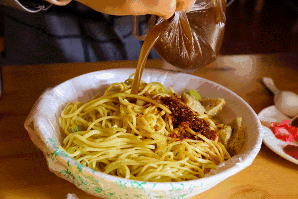 湯汁濃郁,芝麻飄香,一咕嘟對着黃面澆下去,誒呦,香味全出來了!迫不及待去攪拌,讓黃面、麪筋、青菜充分吸收湯汁,才能吃到最好吃的黃面。心情好到一發不可收拾,恨不得多來幾遍動作才能表達此刻心情!