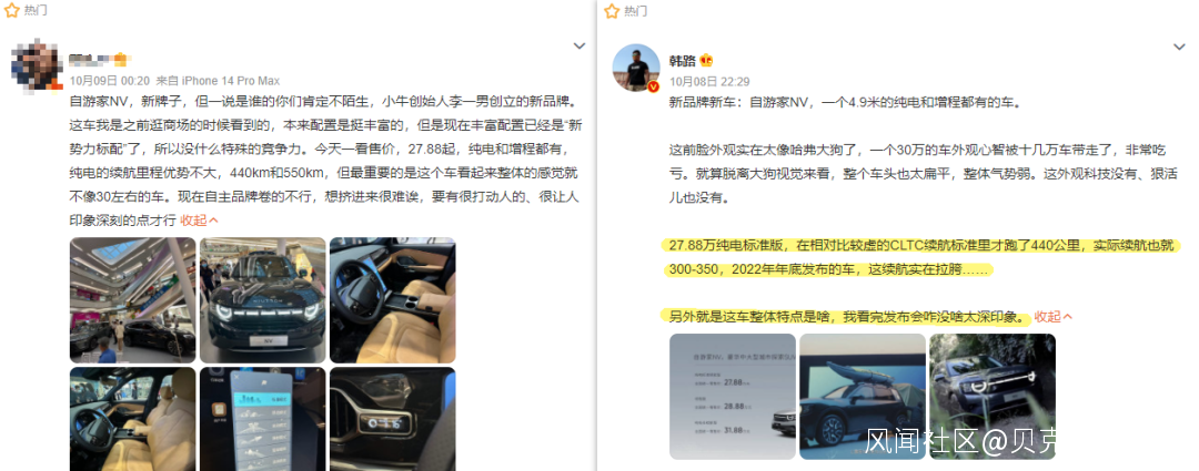 **而知名影評人韓路的評價則更為露骨:**在相對比較虛的CLTC續航標準裏才跑了440公里,實際續航也就300-350,2022年年底發佈的車,這續航實在拉胯……另外就是這車整體特點是啥,我看完發佈會咋沒啥太深印象。