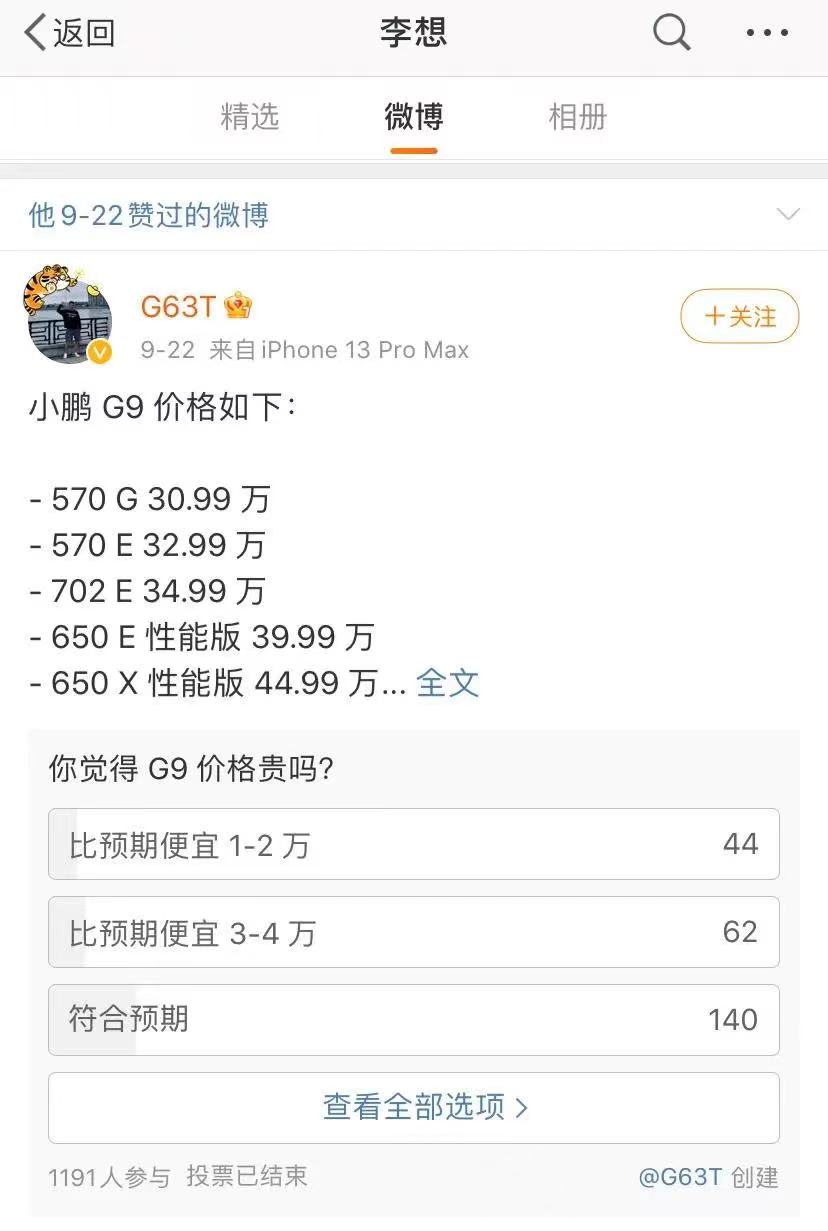 在G9上市當天,點讚了一條微博,內容顯示近80%人認為小鵬G9定價高於預期。