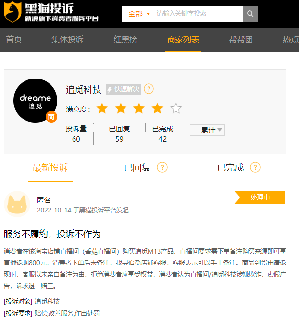 不僅如此,追覓也面臨口碑下滑的風險。「創業最前線」注意到,在黑貓投訴平台上,涉及追覓的投訴合計達60條,而網友們對追覓的投訴主要為產品質量差、售後服務差、虛假宣傳、不發貨與不退款等。
