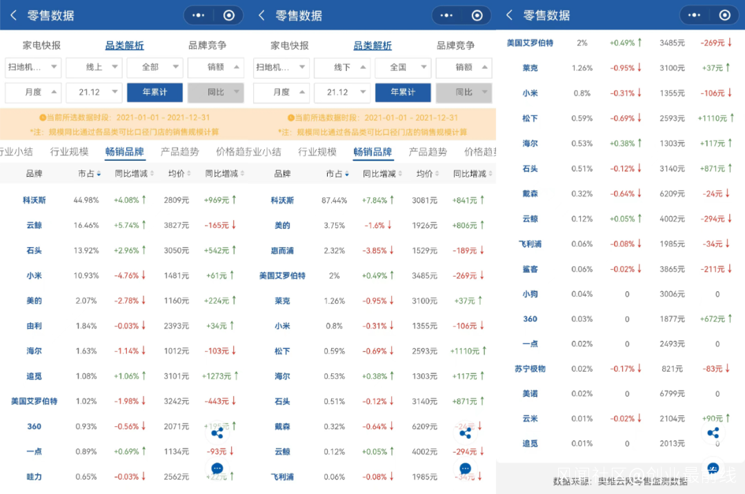 而奧維雲網數據顯示,2020年追覓在吸塵器線上、線下市場的佔有率分別僅為1.58%和0.03%;排名分別為第14和第20。