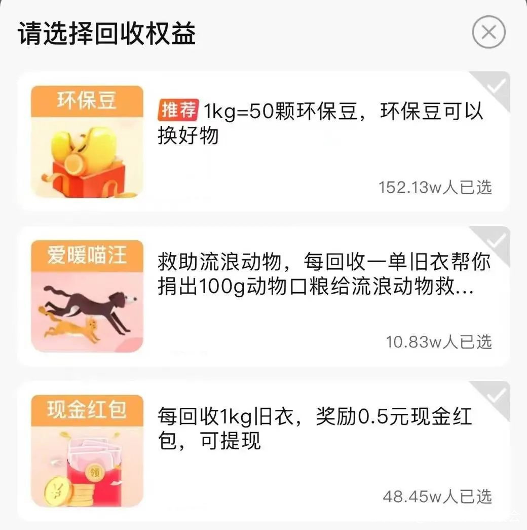 網上回收,1斤舊衣服能賣2毛5,你可以選擇收現金,也可以選換環保豆,或者救助流浪動物一次,或者在沙漠裏種一顆梭梭樹。