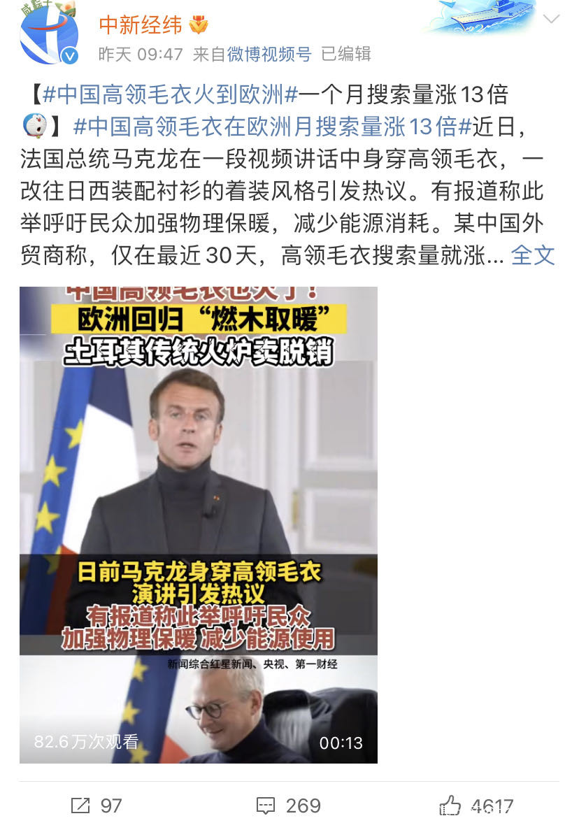 一早看到一條報道,近日,法國總統馬克龍在一段視頻講話中身穿高領毛衣,一改往日西裝配襯衫的着裝風格引發熱議。有報道稱此舉呼籲民眾加強物理保暖,減少能源消耗。