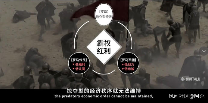 羅馬政府會將各個行省的收税權進行拍賣,價高者得,獲勝者需要將税款一次性付給羅馬政府,然後獲得向當地人收税的權利,這就是包税制。為了在拍賣中取勝,包税商會盡量抬高報價,這意味着他要從當地人手中榨取更多的財富,才能收回成本,並獲取利潤。通過這種殘酷的剝削方式,羅馬統治者攫取了鉅額的財富。這就是羅馬時代的霸權紅利體系,即,經濟上通過對外掠奪獲得高額收入,然後用這筆收入支撐羅馬公民的高福利,以及(獲得公民)對國家的高認同,公民又為羅馬軍團提供了高質量、高忠誠的兵源,最後,(高質量、高忠誠兵源帶來)高戰力的羅馬軍團又為掠奪型的霸權秩序提供了軍事保障。