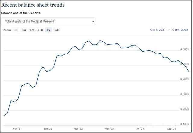 從9月13日到10月4日,美聯儲資產負債表從8.832萬億美元,縮減到8.759萬億美元,縮減了730億美元,已經比較接近美聯儲每月縮表950億美元的上限。