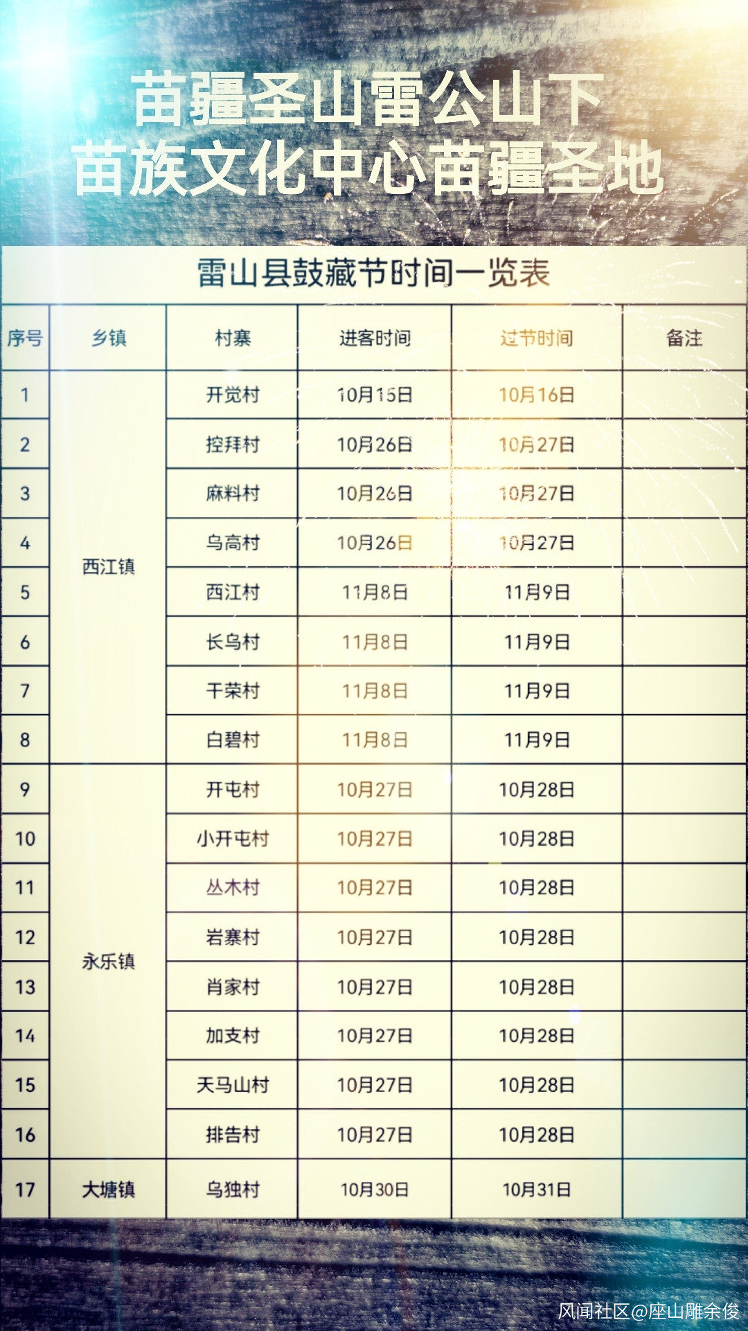 今年,苗疆聖山雷公山下,苗族文化中心苗疆聖地雷山舉辦鼓藏節的苗族村寨,從10月15日起至31日,不分男女老幼,不分主客賓朋,五湖四海天南地北的嘉賓與舉辦鼓藏節的苗族同胞一起,大家共同歌舞昇平燈紅酒綠地高高興興熱熱鬧鬧的歡慶16天16夜。