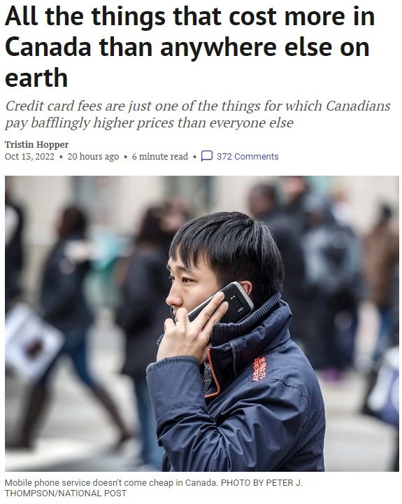 對於那些剛到加拿大的人首先注意到的一件事是手機的高昂費用。在歐洲大部分地區,擁有100 GB移動數據的月度手機套餐只需30元。據芬蘭電信分析師Rewheel稱,在加拿大,這種相同計劃的費用為144元。他們在2021年的一份報告中寫道:加拿大手機費用仍然是世界上最高或最高之中的一個。