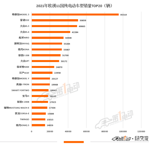 根據 eu-evs 數據,2021 年歐洲 11 個主要國家裏,排在銷冠特斯拉後的兩款車是雷諾 ZOE 和大眾 ID.3。