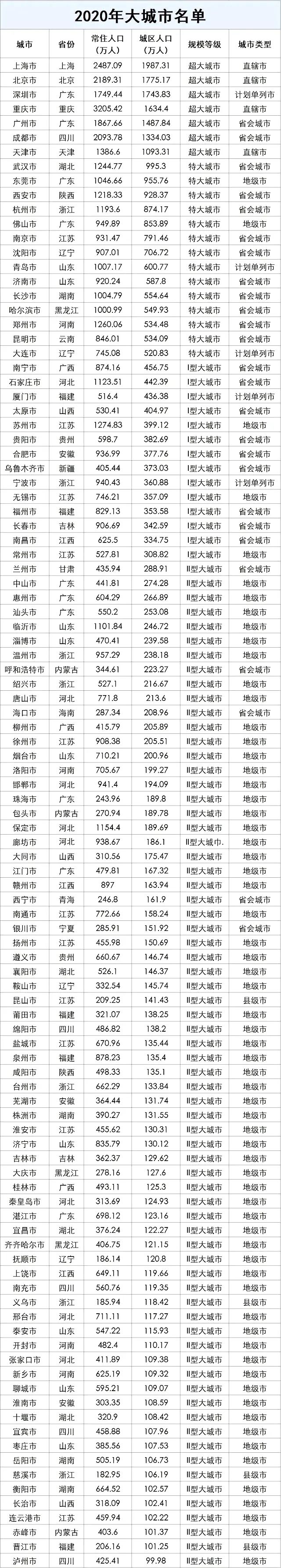 其中,683個城市(包括直轄市、計劃單列市、省會城市、普通地級市及縣級市)的城區人口數據也對外公開。根據城區常住人口數量,將城市分為五類七檔:城區常住人口1000萬以上城市為超大城市,500萬~1000萬為特大城市,而300萬~500萬的I型大城市和100萬~300萬的Ⅱ型大城市並稱為大城市。