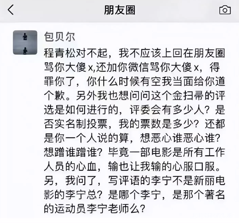 近日,網友曬出一張截圖,疑似包貝爾在朋友圈“親切問候”主辦人程青松,質疑金掃帚獎的公正性。