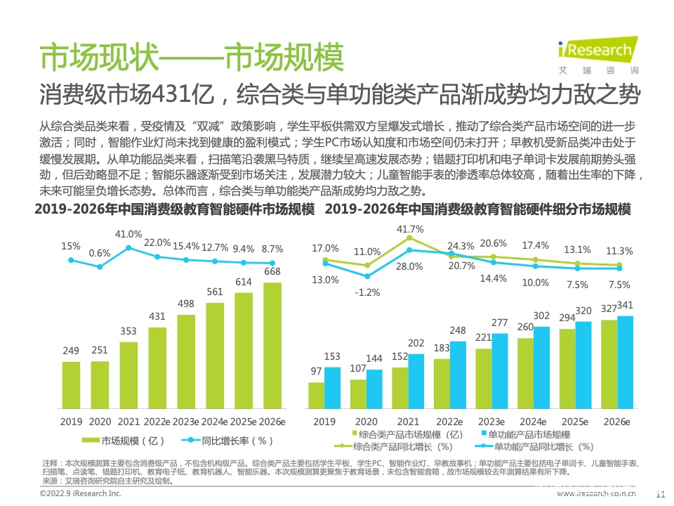 那麼,新舊品類之間的較量現狀如何呢?艾瑞諮詢此前發佈的《2022年中國教育智能硬件市場與用户洞察報告》指出,綜合類與單功能類產品漸成勢均力敵之勢,“受疫情及雙減政策影響,學生平板供需雙方呈爆發式增長,推動了綜合類產品市場空間的進一步激活……從但單功能品類來看,掃描筆沿襲黑馬特質,繼續呈高速發展態勢。”