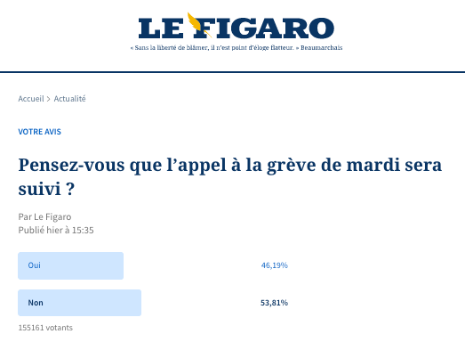 《費加羅報》專門做了一個調查:你認為這次(10月18日)週二的罷工呼籲會得到響應嗎?這次的結果有點讓人出乎意料,截至10月17日週一上午,有155161人蔘與了調查,其中持否定態度的佔了53.81%,超過了半數。
