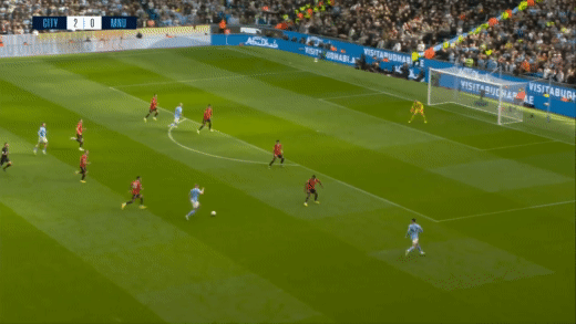 下半場,曼城似有讓京多安回撤,幫羅德里出球,羅德里自己靠右,企圖解放丁丁: