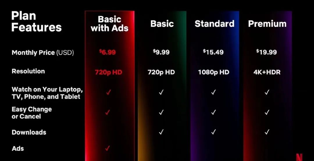上週五,籌備了一段時間的Netflix“廣告版會員”正式露面,在官網發佈的公告當中,Netflix表示,該低價版會員將與11月3日開始上線,定價為6.99美元/月,比當前基礎套餐的9.99美元/月便宜了30%,目前,Netflix服務還包括15.49美元/月的標準套餐和19.99美元/月的高級套餐(僅以美國地區為例)。