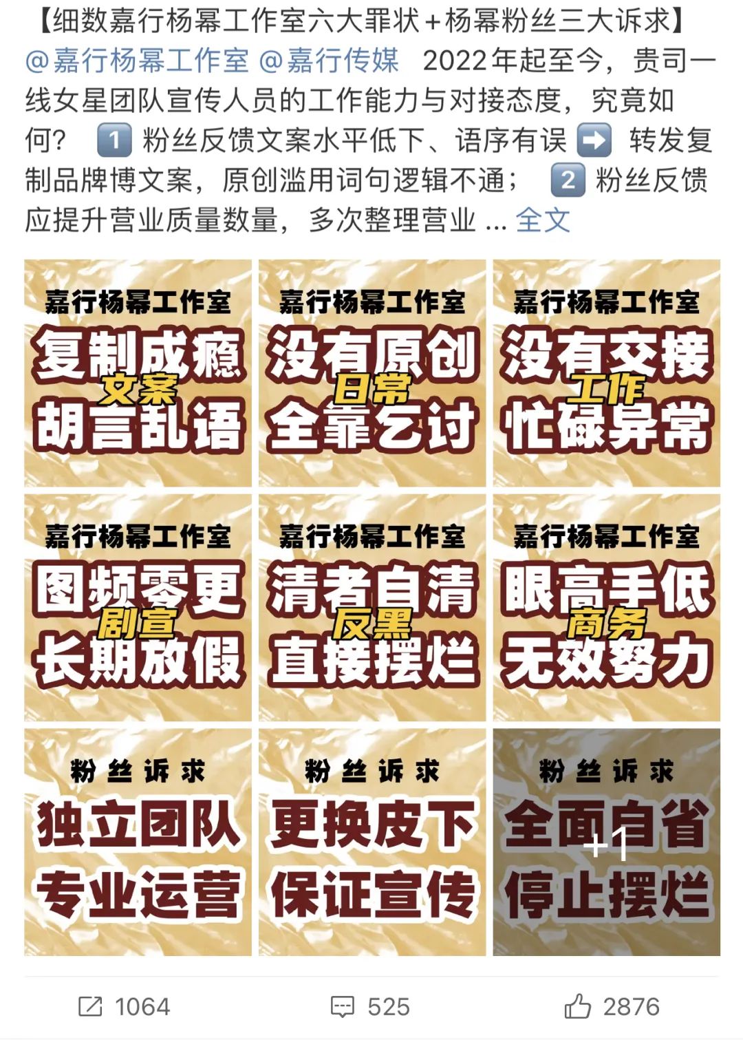 毒眸(ID:DomoreDumou)曾在“楊冪粉絲手撕嘉行,誰比較無辜?”一文中提到過,粉絲的想法總是天真的,一位網友的評價其實已經點出了真相:如果楊冪在嘉行內部有話語權,那粉絲其實就誤會了她的意志;如果楊冪真的被嘉行架在資本之上,他們這樣舉牌抗議只會讓楊冪在公司更加難為。