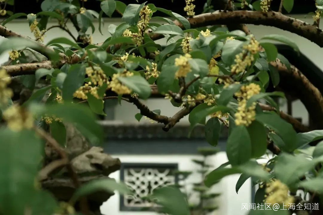 醉白池的雪海堂是歷年來賞桂的“網紅”打卡點。在堂後東、西天井內,各植有一株百年金桂,古樹編號“1161”和“1162”,樹齡超過120歲,歲月賦予了它們蒼虯的枝幹,卻枝繁葉茂,華蓋如亭。