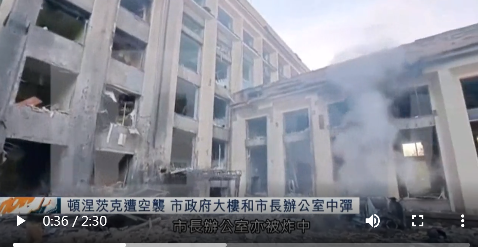 烏軍加強在烏東地區攻勢,被俄軍控制的頓涅茨克週日多處遭到炮轟,地區首府行政大樓和市長辦公室亦被炸中,損毀嚴重。俄當局指責烏軍使用美國提供的海馬斯多管火箭系統發動襲擊。